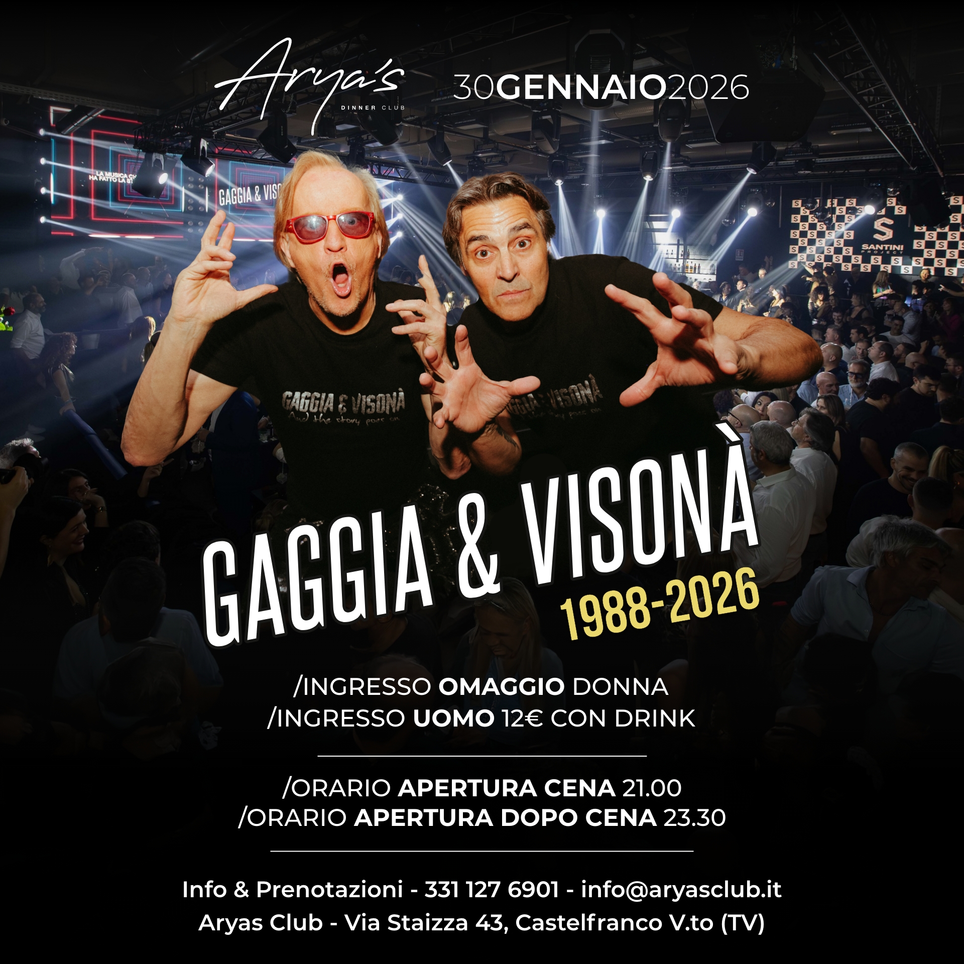 Dagli anni ’70 ai giorni nostri, preparatevi a rivivere i momenti più iconici della storia musicale con la coppia dei djs che ha fatto la storia della movida vicentina e non solo. Dal lontano 1986 fino ad oggi, migliaia di persone hanno ballato al ritmo della loro musica. Gaggia & Visonà hanno incantato e divertito più di 4 generazioni con i loro eccezionali Show & DJ set.